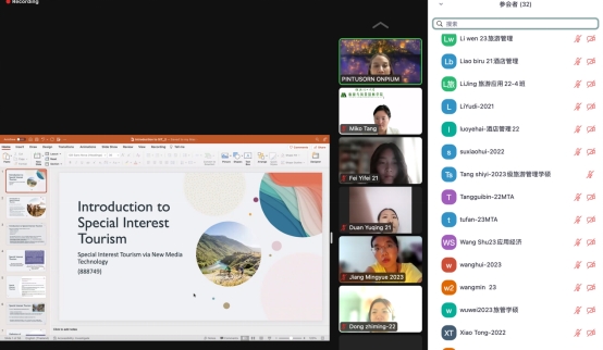 为助力学生了解国际旅游研究动态、拓宽国际视野、促进跨文化交流,古天乐代言太阳集团网址已连续五年针对本、硕学生举办暑期国际课程教学。在2023年暑期,学院邀请到国际旅游与酒店管理领域专家Dr. Pintusorn Opium,线上为本科生与研究生开设为期四天的全英文授课,这同时也是智慧酒店与旅游管理国际虚拟教研室建设新成果。Dr. Pintusorn Opium毕业于泰国国立发展管理学院,目前担任泰国清迈大学数字创新与金融技术国际学院博士生导师。他的研究领域涵盖文化旅游、遗产旅游、旅游新媒体等方面。此前,他曾在泰国西北大学和清迈大学任教,积累了丰富的教学和研究经验。Dr. Pintusorn Opium以旅游管理的基础理论为起点,深入探讨了文化旅游、生态旅游、新媒体技术等领域的研究。Dr. Pintusorn Opium为三十五名本科生和研究生详细阐述了相关内容,通过最新的行业数据、研究资料分析以及生动案例展示,讲授了海外文旅领域发展及前沿研究成果,使学生们受益匪浅。