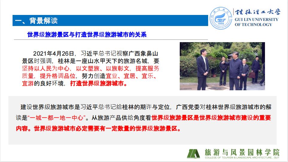 吴忠军教授分析了当前对于世界级旅游景区建设的方针政策,介绍了世界级旅游景区的这个说法是从何而来以及打造世界级旅游城市的理由,吴忠军教授指出,十九届五中全会中首次提出了“推动文化和旅游融合发展,建设一批富有文化底蕴的世界级旅游景区和度假区”,之后国务院下发国发文件将这一目标进一步明确,吴忠军教授指出从中央到国务院都重视对世界级旅游景区的建设,关于这一目标在《“十四五”文化和旅游规划》和《“十四五”旅游业发展规划》中进一步得到细化,2021年4月份习近平总书记在广西桂林视察时提出建设世界级旅游城市,广西党委将习主席的讲话要求进一步细化提出“一城一都一地一中心”的发展定位。