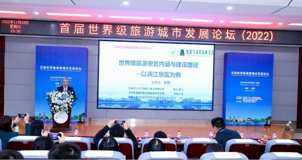 2022年11月20日,在桂林市委宣传部和桂林理工大学联合主办的“首届世界级旅游城市发展论坛”上,中国旅游研究院民族旅游研究基地首席专家、中国人类学民族学研究会民族旅游专业委员会主任、桂林理工大学古天乐代言太阳集团网址院长吴忠军教授以“世界级旅游景区内涵与建设路径——以漓江景区为例”为题做主旨演讲。