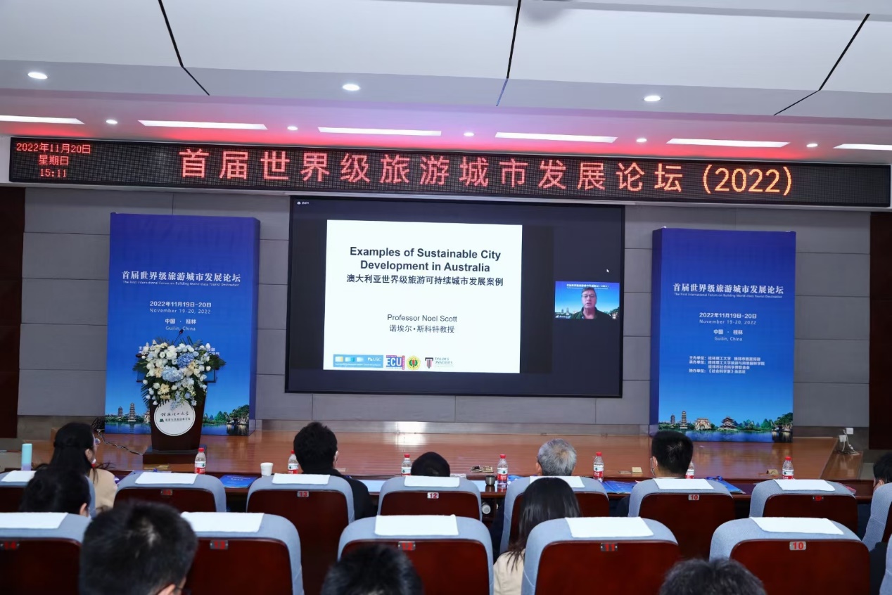 2022年11月20日,在桂林市委宣传部和桂林理工大学联合主办的“首届世界级旅游城市发展论坛”上,国际著名的旅游研究专家、澳大利亚阳光海岸大学(Sunshine Coast University)的诺埃尔· 斯科特(Noel Scott)教授以“澳大利亚世界级旅游可持续城市发展案例”为题做主旨演讲。
