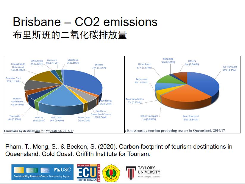 气候变化影响旅游业,而旅游业作为世界上最重要的产业之一,在交通、住宿、餐饮等方面的大量碳排放也严重影响着气候变化。斯科特教授引用《昆士兰州旅游目的地的碳足迹》一文中的数据,指出2016年,昆士兰州碳排放总量占比最大的为布里斯班,占比34%,达3.99公吨,其中,旅游生产部门碳排放量占比最大的为航空交通,占比38%,高达4.45公吨,其次为道路交通,占比24%,碳排放量为2.84公吨。
