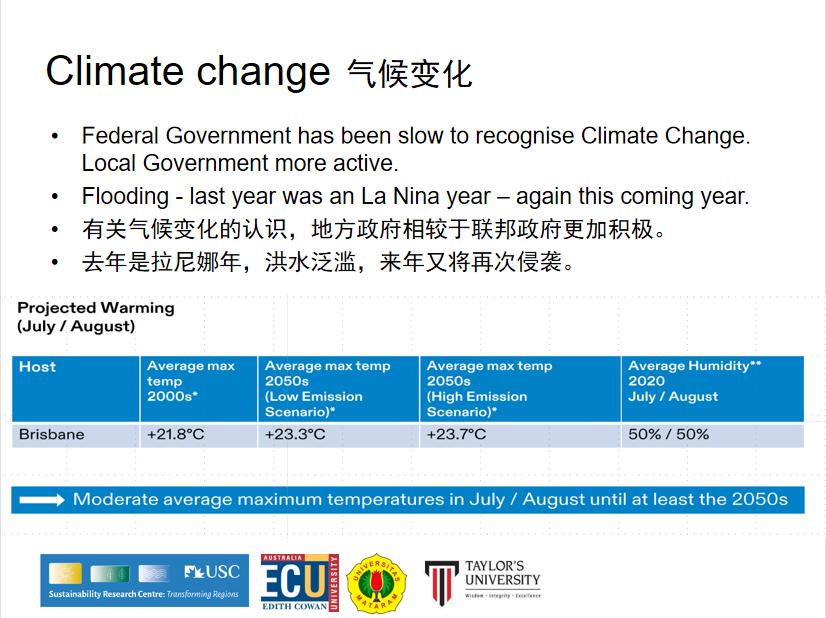 斯科特教授指出,一直以来有关气候变化的认识,地方政府相较于联邦政府更加积极,且去年是拉尼娜年,洪水泛滥,来年又将再次侵袭。在二十一世纪的前十年,布里斯班七八月份的平均气温为21.8℃,但是预计到二十一世纪五十年代,低排放场景下的最高温将达到23.3℃,而高排放场景下会升至23.7℃。2020年布里斯班七八月份的平均湿度为50%。气候变化深刻影响城市发展。