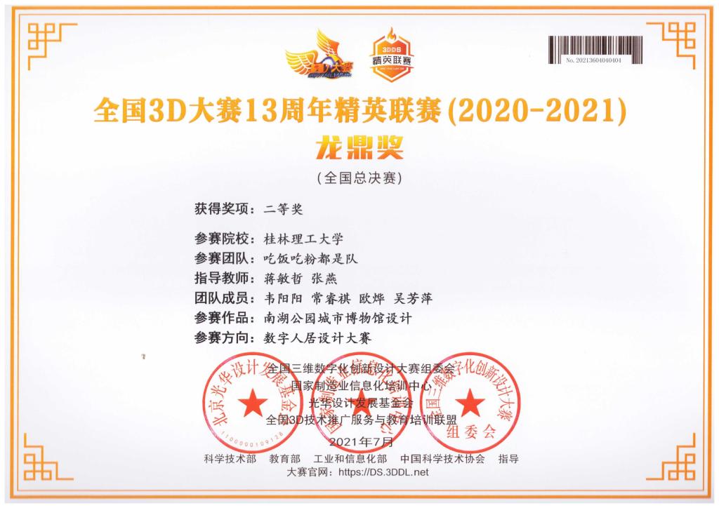 近日,由科学技术部、教育部、工业和信息化部、中国科学技术协会指导,国家制造业信息化培训中心、光华设计发展基金会等单位共同主办的2021全国3D大赛13周年精英联赛全国总决赛落下帷幕, 结合当前疫情防控形势,总决赛采用了线上为主的方式进行。本次大赛共有来自全国389所高校的5556支队伍参赛,在古天乐代言太阳集团网址蒋敏哲、樊亚明、康秀琴、张燕老师的指导下,韦阳阳、常睿祺、欧烨、吴芳萍、王晶晶、孟凡鑫等学生喜获全国二等奖1项,广西赛区特等奖1项、一等奖1项、三等奖1项。