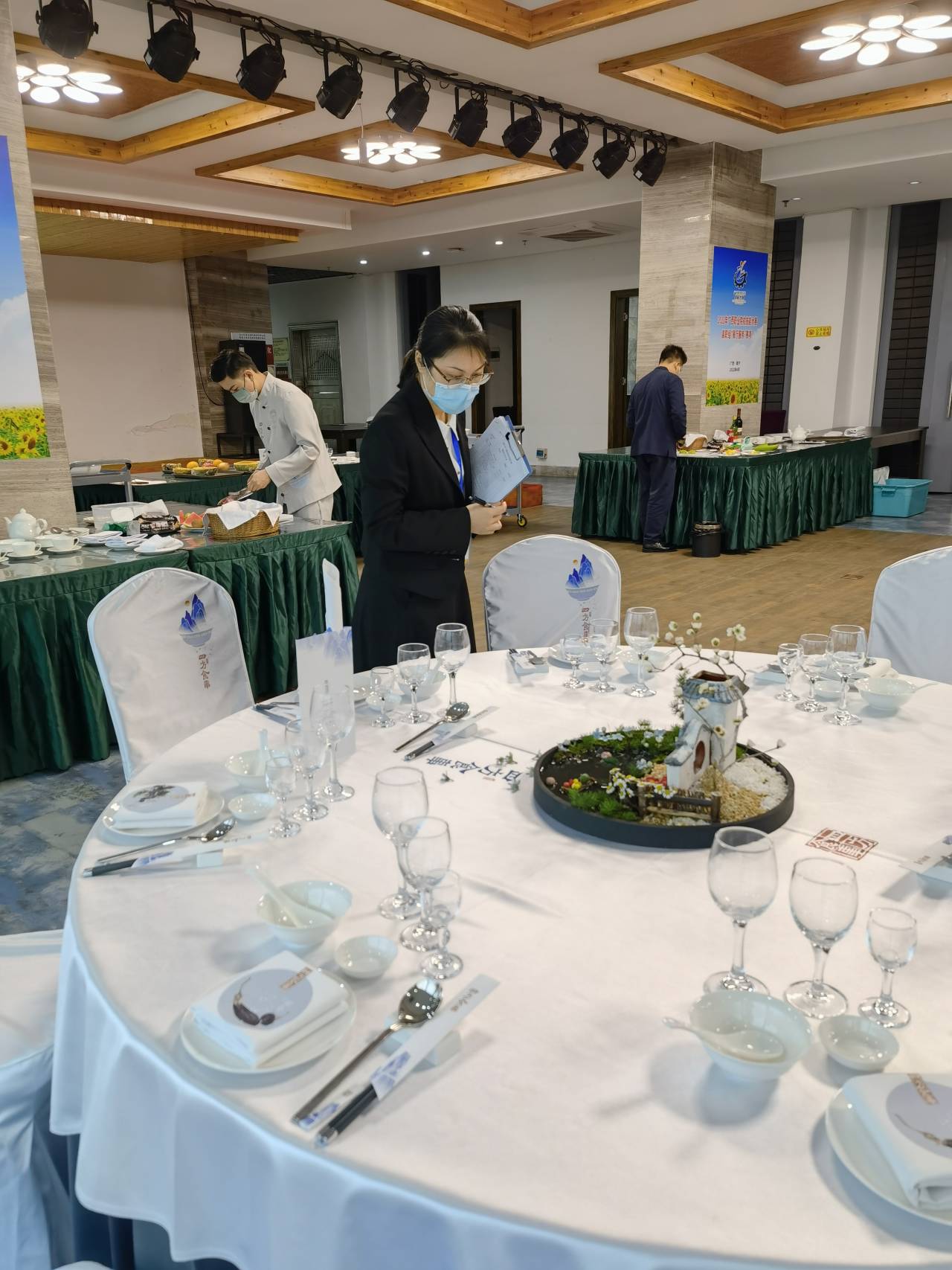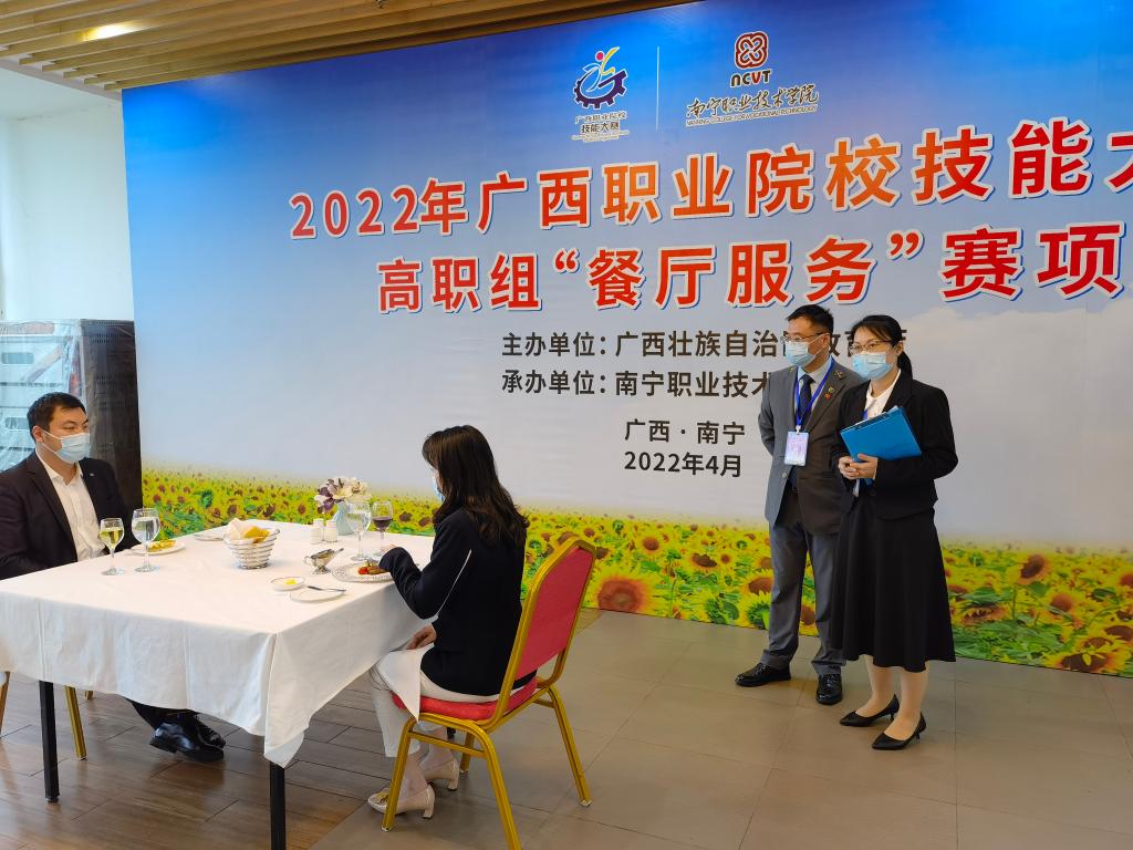 古天乐代言太阳集团网址教师邓敏教授应邀参加广西职业院校技能大赛高职组《餐厅服务》赛项执赛工作。该赛项由广西壮族自治区教育厅主办,南宁职业技术学院承办,于2022年4月17—18日,在南宁职业技术学院金葵酒店举办。该赛项由中餐服务和西餐服务两部分内容组成,其中中餐服务分比赛为主题宴会设计、宴会服务两个模块;西餐服务比赛内容分为鸡尾酒调制与服务、休闲餐厅服务两个模块。此次比赛全区共15所职业院校的60名选手参加比赛。四个模块的比赛都达到了预期目标,参赛选手的作品档次明显提高;主题创意不断升级;布草选择、服务动作,中餐宴会设计整体造型和色彩提升一个层次,选手整体表现较好不仅仅展示了中餐宴会设计、宴会服务、鸡尾酒调制与服务、休闲餐厅服务等四大模块的技能,更是锻炼了他们的旅游专业素养的综合实操能力和实践运用能力。