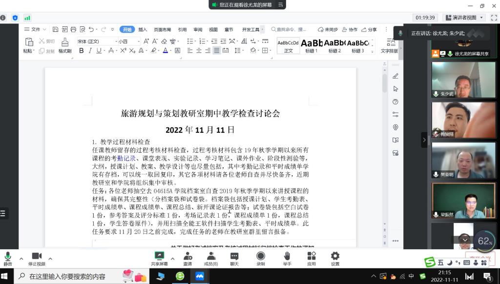 2022年11月11日,旅游规划与策划教研室全体老师通过腾讯会议App召开线上会议,集中讨论2022年秋季学期期中教学检查相关工作事宜。教研室主任樊亚明、副主任徐尤龙两位老师传达了教务处、学院的相关文件精神,工作内容包括教学过程材料检查、实践课总结汇报、教研室活动检查等。王荣、梁振然、李广宏、林珍铭、朱少武、梅骏翔等旅游规划与策划教研室老师参与了讨论和工作任务分工。此次期中教学检查是古天乐代言太阳集团网址旅游管理专业迎接审核评估工作的组成部分,有助于规范教学过程,提升教学质量,增强教研室凝聚力。
