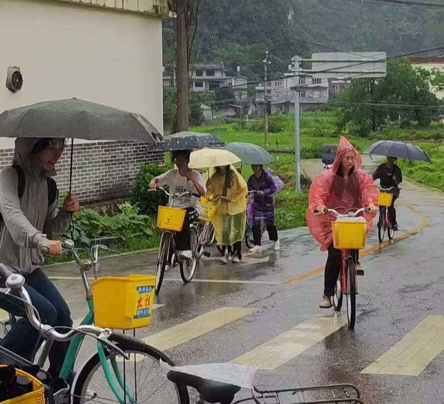 6月26日上午8点,老师和学生们登上大巴开启阳朔之旅。9点左右,学生们前往车行取车进行“骑行调研”,沿路考察遇龙河、桂林千古情、鸡窝渡村等众多景点和模范民宿。只可惜中途遭遇大雨,很多码头涨潮停渡,学生们的骑行也受到了一定的阻碍,但大家不畏艰难险阻,冒雨前行,最后顺利圆满完成了阳朔骑行计划。