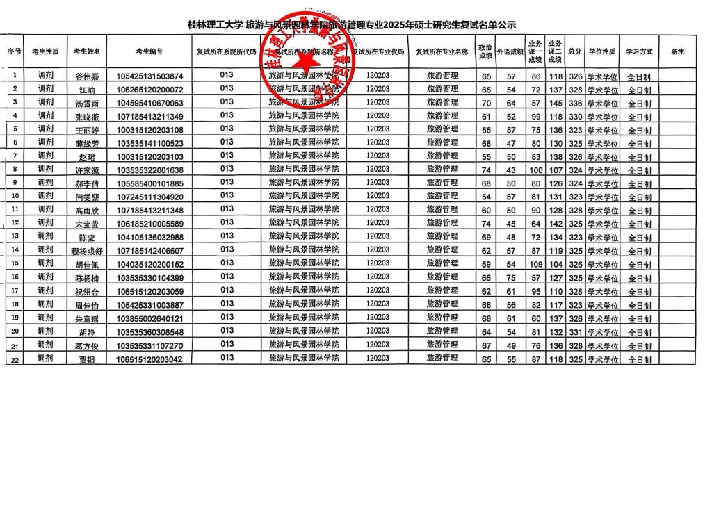 桂林理工大学 古天乐代言太阳集团网址旅游管理专业2025年硕士研究生复试名单公示