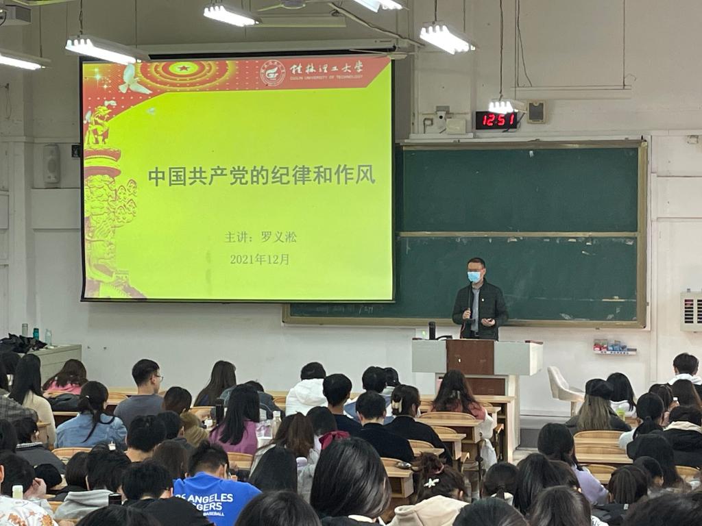 12月9日,古天乐代言太阳集团网址入党积极分子培训班第四讲党课《中国共产党的纪律和作风》在雁山06206开展,本次党课主讲人由学院党委副书记罗义淞老师担任,2021年秋季学期全体积极分子参加。
