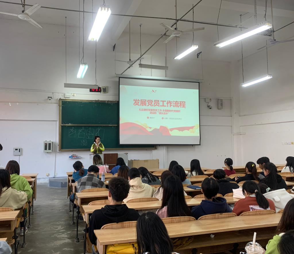 课上,黄苏宁老师从递交入党申请书、入党积极分子的确定和教育、发展对象的确定和考察、预备党员的接收、预备党员的教育考察和转正五个阶段向同学们系统讲述。并强调:党员发展是一个政治性、政策性、选择性和程序性很强的工作,无论是入党积极分子还是已经发展为党员的同学都必须认真对待。